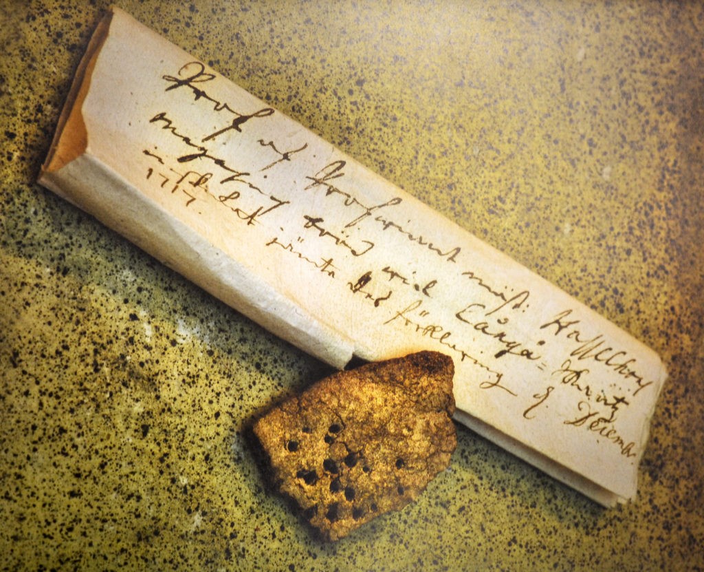 300 år gammal brödbit från Långå Skans. På papperet står det att den inlämnats som prov på magasinsbröd av en proviantmästare vid Skansen år 1717. Ur boken ”De dolda skatterna” (Lamm, Dyhlén, Turander 2014).